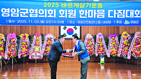 전남도의회 손남일 의원(영암2, 더불어민주당)이 3일 군민회관에서 열린 바르게살기운동 영암군협의회 한마음 다짐대회에서 감사패를 받았다.