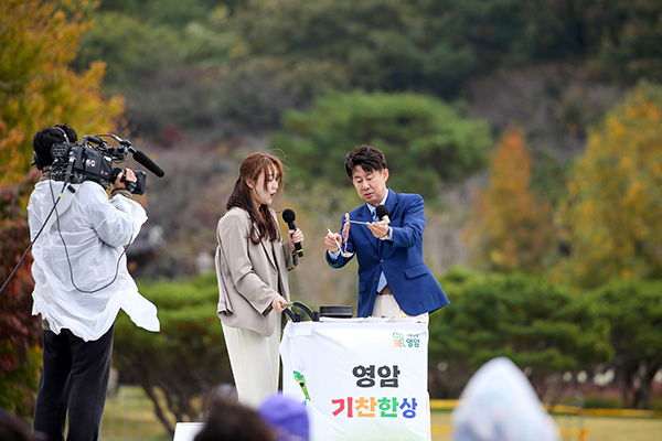 이날 행사는 세찬 바람이 불고, 간헐적 비가 뿌리는 중에도 영암군민 등 관객들이 2시간 넘게 자리를 지키는 열기 속에서 진행됐다. 사전 예선을 통과한 본선 15개 팀은 빼어난 춤과 노래 실력으로 관객들의 성원에 화답했다.