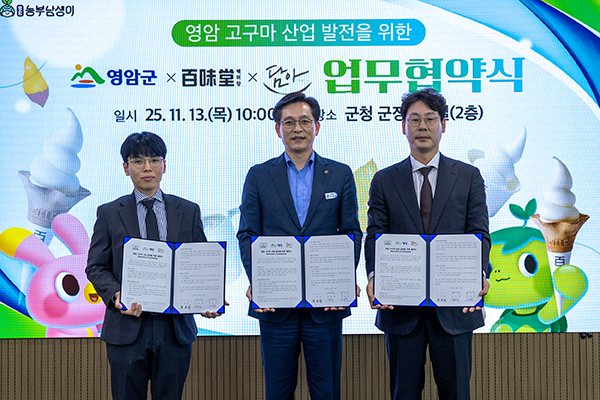 영암군은 13일 홍보실에서 프랜차이즈 ㈜백미당, 지역 고구마 공급업체 ㈜담아와 ‘영암군 고구마 산업 발전을 위한 협약식’을 열고, 지역 농특산품 소비촉진 및 판로개척, 마케팅 홍보에 뜻을 모았다.
