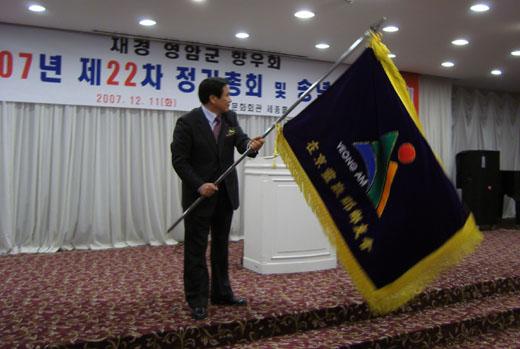 ▲홍정석 회장이 향우회기를 흔들어 보이고 있다.![]()