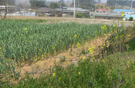 자운영 꽃 흐드러진 비탈진 논둑 아래