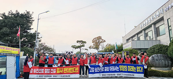 청년회는 이어 “도시와 대기업의 전력 수요를 위해 농촌주민 머리 위로 초고압선이 지나가게 하는 불합리한 계획”이라며 “군민의 동의 없이 일방적으로 추진되고 있다”고 비판했다. 청년회는 또 “영암군은 군민의 생존권을 지키기 위해 모든 행정적 대응책을 마련해야 한다”고 강조한 뒤 “이번 사업은 지역의 환경과 농업기반을 위협하고 미래 세대의 삶을 훼손할 수 있는 중대한 사안이며, 대책위원회와 함께 고향의 땅과 하늘을 지키기 위해 끝까지 싸울 것”이라고 밝혔다.