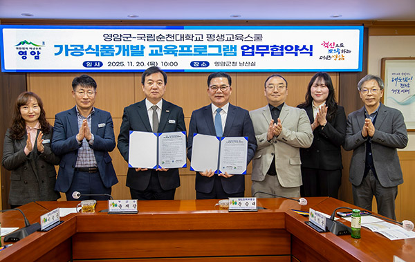 영암군은 지난 20일 군청에서 국립순천대 평생교육스쿨과 ‘가공식품개발 교육프로그램 업무협약’을 체결했다.